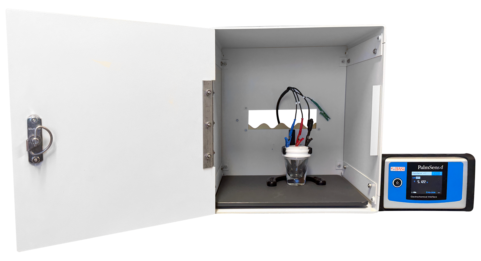 Combine Faraday Cage with our Pete’s Multifunctional Electrochemistry Kits using the Pete's Mutifunctional Cell Holder for high precision measurements on micro-electrodes, screen printed electrodes, or general noise-free electro-analytical chemistry.