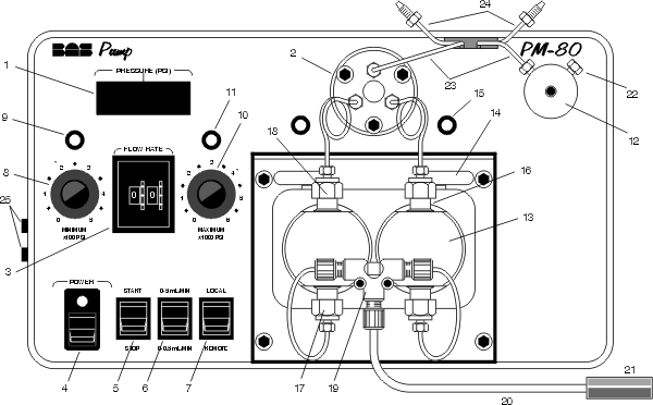 The following two figures show front and back views of the PM-80 pump. The parts identified by number are described below.