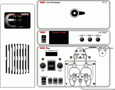 The PM-80 pump is designed to serve as the base for a stack of BASi chromatography instruments. A typical setup is illustrated by the BAS-480e chromatograph. The components of this system are (from the bottom up) the PM-80 pump, LC-22C temperature controller, and CC-5 flowcell compartment. The epsilon LC detector is on the left.