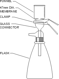 Filter all mobile phases through a 0.2µm membrane filter. The figure below illustrates the filtering device recommended by BASi for doing this. It is borosilicate glass throughout, and uses ground glass joints to avoid contamination from stoppers. The filtration step will reduce problems with column degradation significantly.