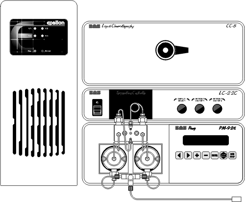 The PM-90 pump is designed to serve as the base for a stack of BASi chromatography instruments. A typical setup is illustrated by the BAS-502e chromatograph. The components of this system are the PM-92 pump, LC-22C temperature controller, and CC-5 flowcell compartment. The epsilon LC detector is on the left.