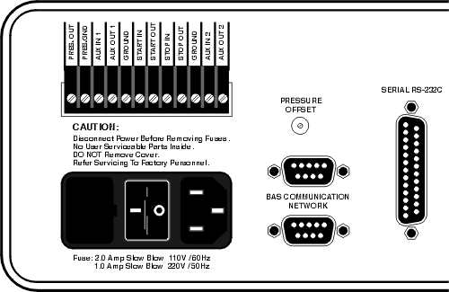 The power cord attaches to the PM-90 via the receptacle on the rear of the instrument. The pump can be operated with either 100, 120, 220, or 240 VAC and 50 or 60 Hz power. The instrument uses a fused self-sensing power supply. There is no need to make power related adjustments. You should check to see that the fuse is the proper rating for the voltage used: