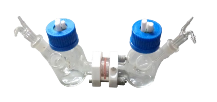 The IP-HC(5-1000) are a fully equipped, horizontally mounted and a dual compartment electrochemical H-Cell set-up for a wide variety of studies that require a separate compartment for counter and / or reference electrodes. The construction is gas-tight having two separate chambers each with 5-1000 ml volume capacity and each equipped with gas inlet and outlet option. This allows bubbling the solution and evacuating gases. Chambers can be separated with an ion-exchange membrane, so the electrochemical products appearing at working and counter electrode do not affect the opposite electrode. A pack (Qt. 5) of Nafion N117 membrane equivalent can be provided upon request. Upon request, each chamber can be temperature controlled using a glass tube that can be placed inside each chamber. Set-up is compatible with a power source meter or a typical Potentiostat / Galvanostat.