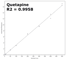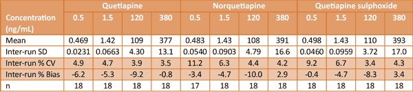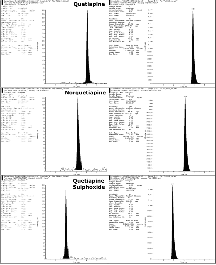 Table 3 shows the matrix effects observed for each analyte. Only quetiapine sulphoxide appeared to undergo any degree of matrix suppression although this was successfully compensated for by the IS.