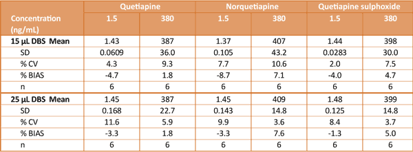 The DBS technique was used successfully to determine the concentration of quetiapine, norquetiapine and quetiapine sulphoxide in human whole blood samples. By focusing on the chromatographic conditions and sample preparation the desired LLOQ of 0.5 ng/mL was achieved.