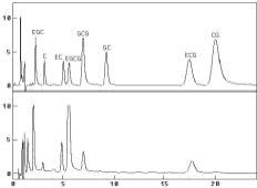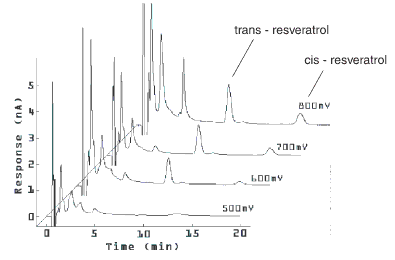 In this technique, the components of a complex mixture such as found in most botanical products are first separated by HPLC. The separated components can then be analyzed at up to four different electrodes set at four different voltages simultaneously. This allows optimal electrochemical detection for the different components in the sample, thus increasing the sensitivity of the analysis. This method provides additional ability to identify substances because one has not only the optimal voltage for a particular compound but the ratios of peak areas or heights at different voltages, which can also be used as an identification tool. These methods have been developed at BASi for the Analytical Core of the Purdue University Botanical Center on Age Related Diseases.