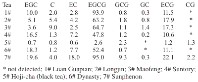 Green teas from China (Guapian, Longjin, and Maofeng), green teas from Japan (Suntory and Dynasty), black tea from Japan (Hoji-cha), and green tea extract from Japan (Sunphenon).