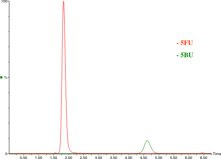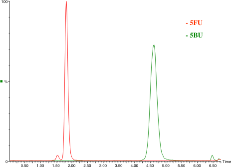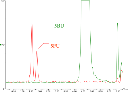 5-Fluorouracil (5FU), a low molecular weight and highly polar fluorinated pyrimidine, is an antineoplastic antimetabolite given intravenously in chemotherapy. An LCMS/ MS method was developed and validated to quantify 5FU in small volumes (0.1 mL) of human plasma, using 5-bromouracil (5BU) as the internal standard.