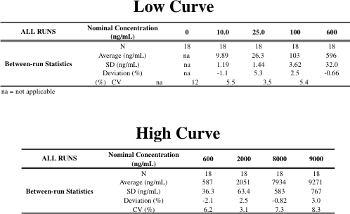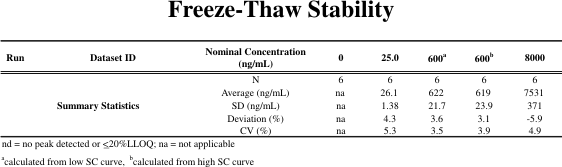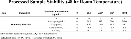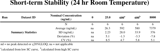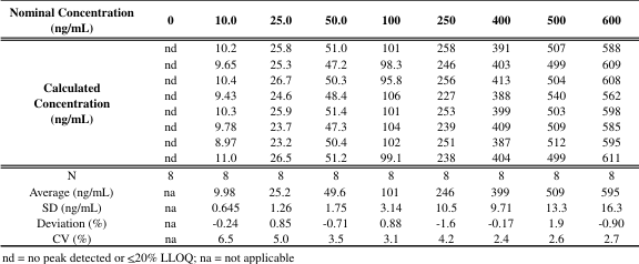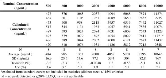The assay required a relatively wide range with a small sample size; a short run time was also desirable. The LC-MS/MS method described here uses a sample size of 0.1 mL plasma and a calibration range of 10-10,000 ng/mL using two overlapping standard curves (10-600 ng/mL and 600-10,000 ng/mL). Two separate standard curves are required to cover the range due to non-linearity. The analysis time is 7 minutes.