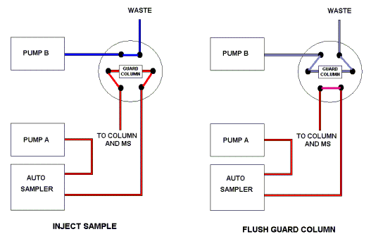 LC pump and column configurations for sample injection (left) and sample analysis (right).