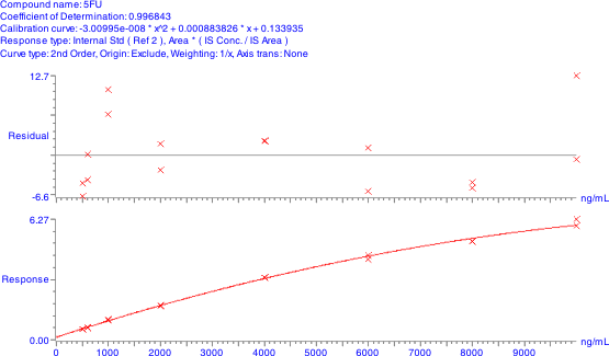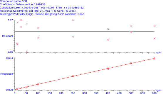 The method was validated over three days for accuracy, precision, ruggedness and robustness. Assay range was 10-10,000 ng/mL (up to 1,000,000 ng/mL with dilutions) using two overlapping standard curves (10-600 ng/mL and 500-10,000 ng/mL). Curve fit was nonlinear (weighted quadratic). %RSD ranged from 1.6 to 11% within run (n=6) and 3.1 to 12% between runs (n=18). Accuracy ranged from -9.9 to 11% within run (n=6) and -2.1 to 5% between runs (n=18). Samples were stable through 3 freeze/thaw cycles and heat treatment of 30 minutes at 56°C for deactivation of the HIV virus. Multiple plasma sources showed no interferences >20% of the lower limit of quantification. A panel of 10 co-administered and OTC drugs showed no interferences. The assay has been successfully used to quantify 5FU in clinical samples.