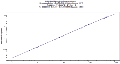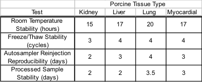 BASi® developed and validated an LC-MS/MS method for the quantification of rapamycin in porcine whole blood and tissues. The validation included the assessment of linearity, within-run and between-run precision and accuracy, specificity, freeze/thaw stability, short-term (room temperature) stability, the effect of dilution, and extraction efficiency. The method is suitable for analysis of samples over the range 0.1 - 100 ng/mL in porcine whole blood and 0.5 - 500 ng/mL in porcine myocardial, liver, lung, and kidney tissues.