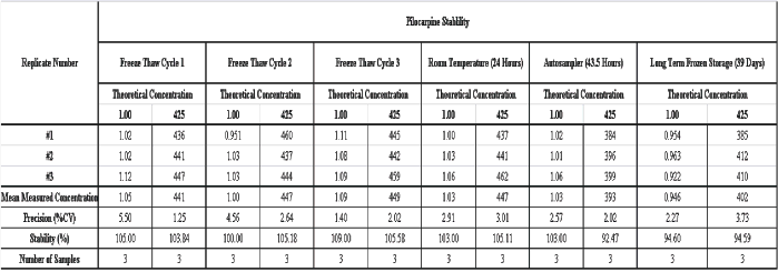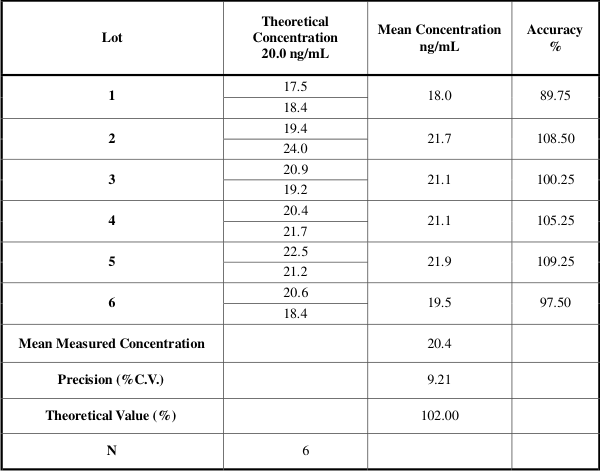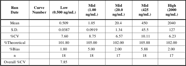 The between-run precision and percent bias of the method ranged from 6.23 to 10.11% and from 1.80 to 5.88% respectively (Table 1).