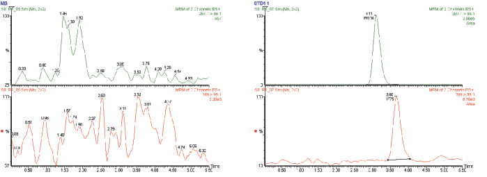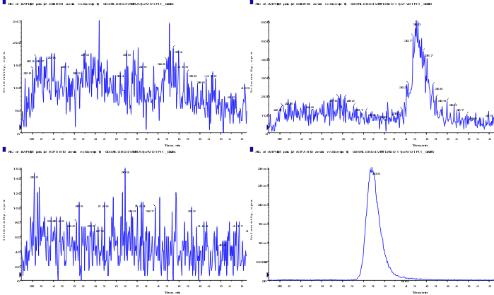 Figure 2 illustrates representative chromatograms of a human plasma blank and standard containing 0.500 ng/mL.