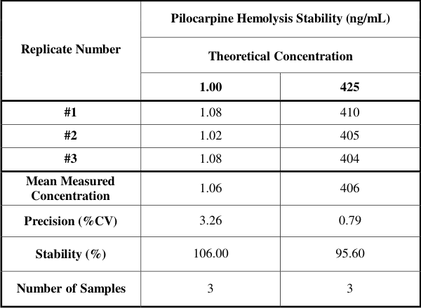 To verify the extraction in the presence of hemolyzed blood, an amount of hemolyzed blood was added to the plasma so that the plasma contained 2.00% hemolyzed blood. The plasma containing hemolyzed blood was then extracted; one blank with internal standard, one blank without internal standard and triplicate spiked samples at concentrations of 1.00 and 425 ng/mL of pilocarpine. In the presence of 2% hemolyzed blood, the mean recovery of pilocarpine was 100.80%. The results of the hemolysis experiments are shown in Table 3.