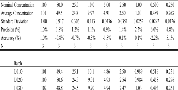 Sample throughput and reproducibility for Olanzapine was increased using automated 96-well solid phase extraction. A manual solid phase extraction was transferred to the 96-well format using the Tomtec Quadra 96 . Sample volume was reduced from 1mL to 0.75mL. Prior to loading samples, the SPE plate is conditioned with methanol and phosphate buffer. After sample loading, the plate is rinsed with phosphate buffer and a wash solution before eluting with a basic elution solution. A successfully validated method transfer was obtained. The resulting assay was more sensitive, selective, accurate and precise than the manual method. Inter-assay precision and accuracy by the automated method ranged from 3.2% to 5.6%, and 1.4% to 1.9% respectively. Inter-assay precision and accuracy for the manual method ranged from 1.7% to 10.0%, and 1.6% to 3.7% respectively. The automated assay drastically reduces sample preparation time (at least a 3-4-fold decrease) decreases labor costs and increases throughput in clinical studies. Automation reduces the tedious nature of manual extraction and also decreases the incidence of lower IS recovery. This in turn leads to better batch to batch reproducibility.