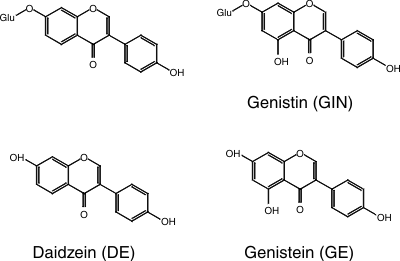 Two of the most abundant isoflavones are daidzein and genistein, which occur both in free state and as glycosides (Figure 1). They are the focus of this study, mainly because they have been proposed to be the bioactive ingredients by many studies.