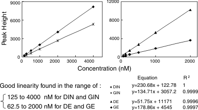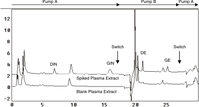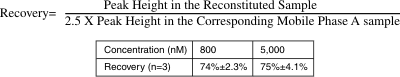 DIN stock solution, 100 µM in saline, was spiked into rat plasma and mobile phase A to yield two different concentrations, 5,000 and 800 nM. The spiked plasma samples were extracted according to the sample preparation procedures. The 5,000 nM mobile phase A sample and the reconstituted plasma sample was further diluted 5 times to make sure that they fell within the range of the calibration curve. The 800 nM samples were subject to HPLC analyses directly. Table 4 demonstrated that samples of the higher concentration (5,000 nM) have the same recovery rate as those of the lower concentration (800 nM).