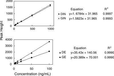The spiked plasma was taken through the sample preparation procedures, and analyzed by HPLC. Typical Calibration Curves for Quantifying isoflavones in Rat Plasma.