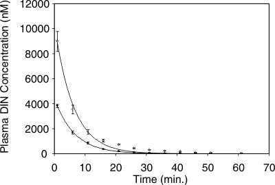 Plasma concentration of DIN vs. time. Filled circle: after i.v.