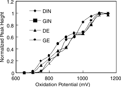 A BASi Epsilon™ multi-channel EC detector was coupled with HPLC. A four channel glassy carbon working electrode was set in a radial flow configuration and referenced to a Ag/AgCl electrode. Different oxidation potentials, differing 50 mV, were simultaneously applied on the four channels. Normalized peak height was plotted against the oxidation potential (Figure 5). The multi-channel EC detection allows peak profile matching between standards and their LC retention equivalent peaks.