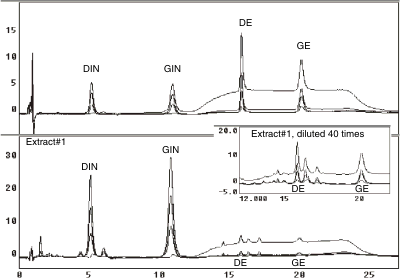 Standards were dissolved in different extraction solvents and sonicated for various length of time. It was concluded that higher percentage of water and longer sonication cause degradation of DIN and GIN (data not shown). The sample preparation procedure was finalized as follows: