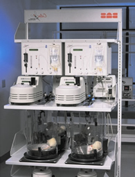 Culex® automated blood sampler is designed to collect whole blood, urine and faces over a long period of time from awake, freely-moving animals like rats, dogs and primates as shown in Fig. 2 for a BASi Culex ® system. Each unit can house four rats. The BASi Culex ® system collects blood in sealed, refrigerated vials, which are transferable to a 96-well plate for automated sample preparation. It provides simultaneously automated serial blood sampling, behavior monitoring and microdialysis from a rodent metabolism cage for PK, PD and CNS effect studies [3].