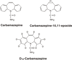 No endogenous rat plasma components were observed at the retention times corresponding to all two analytes and D10-cabamazepine (internal standard). The lower limit of quantitation (LLOQ) is 5 ng/mL for each analyte, based on 0.1 mL aliquots of rat plasma. The extraction recovery of analytes from rat plasma was over 87%. Linearity is observed over the range of 5-2000 ng/mL. The intra- and inter-day accuracy and precision values for QC samples are present in Table 2.