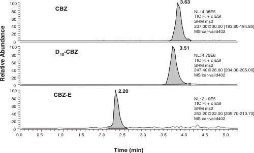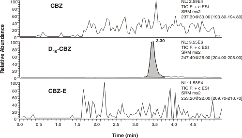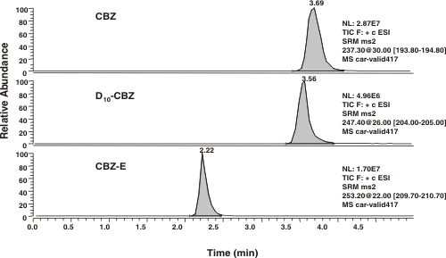 Quantitation was conducted using the selected reaction monitoring (SRM) mode. Table 1 summarizes the product ion spectra of the two analytes and D -carbamazepine. The best sensitivities and minimum interferences were achieved by monitoring the transitions stated in Table 1. The chromatographic separation was achieved within 5 min using a C8 (150 x 2.1 mm) 5 mm column with a mobile phase containing 0.5% acetic acid and 30% acetonitrile at a flow- rate of 0.4 mL/min. Figures 4, 5 and 6 show typical chromatograms of an extracted drug-free rat plasma blank, plasma spiked with all analytes at 5 ng/mL (LLOQ) and plasma spiked with all analytes at 500 ng/mL, respectively.