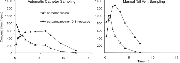 It has been recognized that stress of conventional sampling from awake rats drastically influences rodent physiology (blood pressure, blood flow) and biochemistry (stress home release, metabolism, even protein expression) [4]. Automated blood sampling permits awake cannulated animals to be sampled stress free (without restraint and human handling). The latter situation provides the most consistent and meaningful data for PK studies. Table 3 shows PK parameters of CBZ and its epoxide metabolite in plasma from the same rat using two different blood sampling methods. It can be seen clearly that when PK data are obtained from an animal under stress, the normal parameters of Cmax, Tmax, AUC and CL can all vary very substantially.