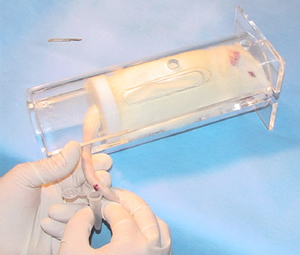 Male Sprague-Dawley rats weighting 300-400 g were used for the study. For automatic sampling, rats were implanted with a jugular vein catheter (CX-2010, BAS,West Lafayette, IN, USA) and/or femoral vein catheter (CX-2020, BAS). After surgery, the rats were installed in the Raturn™ BASi and allowed to recover for one day with free access to food and water. The rats were fasted overnight before dosing orally with CBZ at a dose of 5 mg/kg. A volume of 0.25 mL blood sample was withdrawn from the jugular vein into a vial, containing heparine and kept in a refrigerated fraction collector according to a preset schedule in BASi Culex ® BASi automated blood sampling system. For manual sampling, rats were restrained in a restraint box and the blood samples were collected via the tail vein. Figures 2 and 3 illustrate the automated blood sampling and manual sampling system. The analytical method consists of a liquid-liquid extraction procedure and electrospray LC/MS/MS analysis The samples were then analyzed off-line by reverse phase liquid chromatography electrospray tandem mass spectrometry. The LC/MS/MS system was equipped with a BASi PM-80 pump coupled to a Finnigan LCQ Deca ion trap mass spectrometer (ThermoQuest, San Jose, CA, USA). The mass spectrometer was operated in ESI positive ion mode. The column was a Supecol Discovery C8, 5 mm, 150 x 2.1 mm with. A mobile phase containing 0.5% acetic acid and 30% acetonitrile at a flow-rate of 0.4 mL/min. D - Carbamazepine (D10-CBZ) is used as the internal standard for all compounds.
