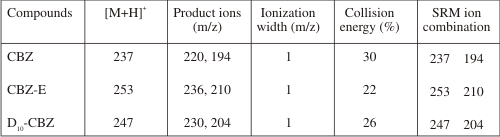 T1 Positive product ion mass parameters of CBZ, CBZ-E and D10-CBZ