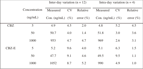 The precision values (coefficient of variation) at the three concentrations in the intraassay study varied between 2.6 and 5.2% for CBZ and 4.9 and 9.5% for CBZ-E while that of inter-assay study varied between 4.0 and 4.7% for CBZ and 8.7 and 9.6% for CBZ-E. The accuracy (relative error) values for all three concentrations deviated less than 4.7% FOR CBZ and 5.2% for CBZ-E from the corresponding nominal concentrations. This method has been used for the pharmacokinetic study of CBZ and CBZ-E.