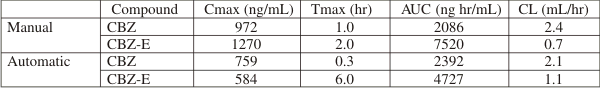 After giving a single oral dose of 5 mg/kg of CBZ, the rat was sampled by an automated blood sampling system or by traditional manual draws. The plasma was collected at specific time points for the determination of the analytes. The plasma concentration-time plot of CBZ and CBZ-E for both automatic and manual sampling is shown in Figure 7.