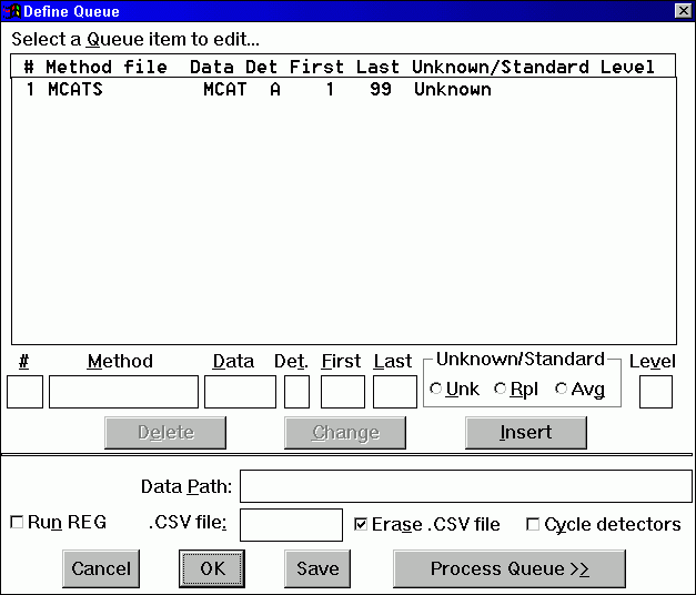 When REPORT is active, load a data file for any one of the runs of interest. This will both set the appropriate default data location, and allow you to process a sample run and tailor the report to your needs. Next use REPORT's QUEUE dialog box to instruct the software on the Method(s) to use and the runs to process: