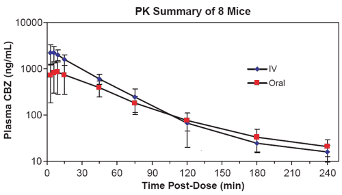 Sample from the carotid artery or jugular vein. To minimize blood loss, mice are sampled with a No Blood Waste method. Samples can be taken as close as 3 minutes apart with volumes as small as 5µL. These small volumes permit bioavailability studies in individual mice. Run your method anytime of the day or night and use the program to simultaneously collect behavior. |